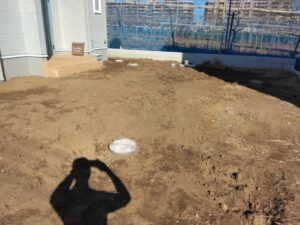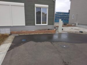 広いので何でもできますが、シンプルに玄関前にアプローチ、奥は人工芝、手前は土間の仕上がり予定です。
