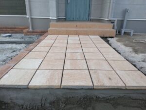 ブロックではなく、おしゃれなレンガを積んで土留めを作っていきます。あとで、防草シートを敷いて砂利敷きをするので雑草の心配もありません。