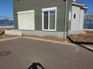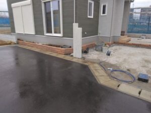 広いので何でもできますが、シンプルに玄関前にアプローチ、奥は人工芝、手前は土間の仕上がり予定です。