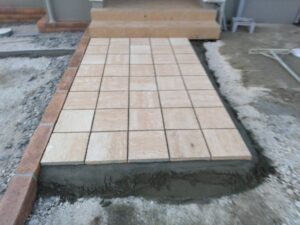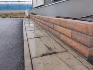 ブロックではなく、おしゃれなレンガを積んで土留めを作っていきます。あとで、防草シートを敷いて砂利敷きをするので雑草の心配もありません。