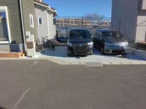 土間も乾き、車も停められるようになりました。機能門柱のポストも可愛いです♪
